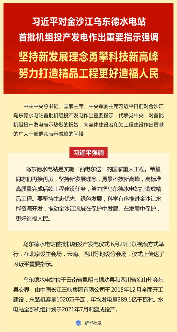 新華社北京6月29日電 中共中央總書記、國家主席、中央軍委主席習(xí)近平日前對金沙江烏東德水電站首批機(jī)組投產(chǎn)發(fā)電作出重要指示,代表黨中央,對首批機(jī)組投產(chǎn)發(fā)電表示熱烈的祝賀,向全體建設(shè)者和為工程建設(shè)作出貢獻(xiàn)的廣大干部群眾表示誠摯的問候。 習(xí)近平強(qiáng)調(diào),烏東德水電站是實(shí)施“西電東送”的國家重大工程。希望同志們再接再厲,堅(jiān)持新發(fā)展理念,勇攀科技新高峰,高標(biāo)準(zhǔn)高質(zhì)量完成后續(xù)工程建設(shè)任務(wù),努力把烏東德水電站打造成精品工程。要堅(jiān)持生態(tài)優(yōu)先、綠色發(fā)展,科學(xué)有序推進(jìn)金沙江水能資源開發(fā),推動金沙江流域在保護(hù)中發(fā)展、在發(fā)展中保護(hù),更好造福人民。 烏東德水電站首批機(jī)組投產(chǎn)發(fā)電儀式29日以視頻方式舉行,在北京設(shè)主會場,云南、四川等地設(shè)分會場,儀式上傳達(dá)了習(xí)近平重要指示。 烏東德水電站位于云南省昆明市祿勸縣和四川省涼山州會東縣交界,由中國長江三峽集團(tuán)有限公司于2015年12月全面開工建設(shè),總裝機(jī)容量1020萬千瓦,年均發(fā)電量389.1億千瓦時。水電站全部機(jī)組計劃于2021年7月前建成投產(chǎn)。