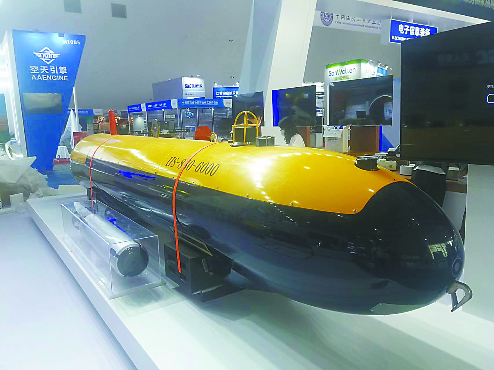 相比公眾相對熟悉的無人機和無人車,無人船和無人潛航器的知名度略低,但本屆珠海航展上展出的相關(guān)裝備具備相當高的水平。例如HS-880-6000型自主式水下航行器(AUV)就是國內(nèi)首型搜救型無人潛航器。它的最大工作深度達6000米,能以3節(jié)的速度連續(xù)航行24小時,配備有深水遇險目標高分辨低照度照明系統(tǒng)、聲信標定向引導(dǎo)聲吶、水聲探測側(cè)掃聲吶等,具備工作水深范圍寬、載荷能力大、續(xù)航力長、搜尋探測能力強等特點,可對深海目標全自主精細搜尋、探測、定位,執(zhí)行深海水下目標搜尋探測和海洋科學(xué)研究任務(wù)。另一款“守望者”無人潛航器個頭小巧,配備有光學(xué)探頭、戰(zhàn)斗部和通信設(shè)備,可以自動靠近水中或海底目標進行觀測、毀傷目標,用于執(zhí)行反水雷、排障、海底管道巡檢等任務(wù)。