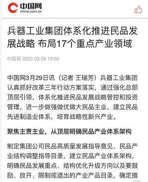 中國網(wǎng):兵器工業(yè)集團體系化推進民品發(fā)展戰(zhàn)略 布局17個重點產(chǎn)業(yè)領(lǐng)域