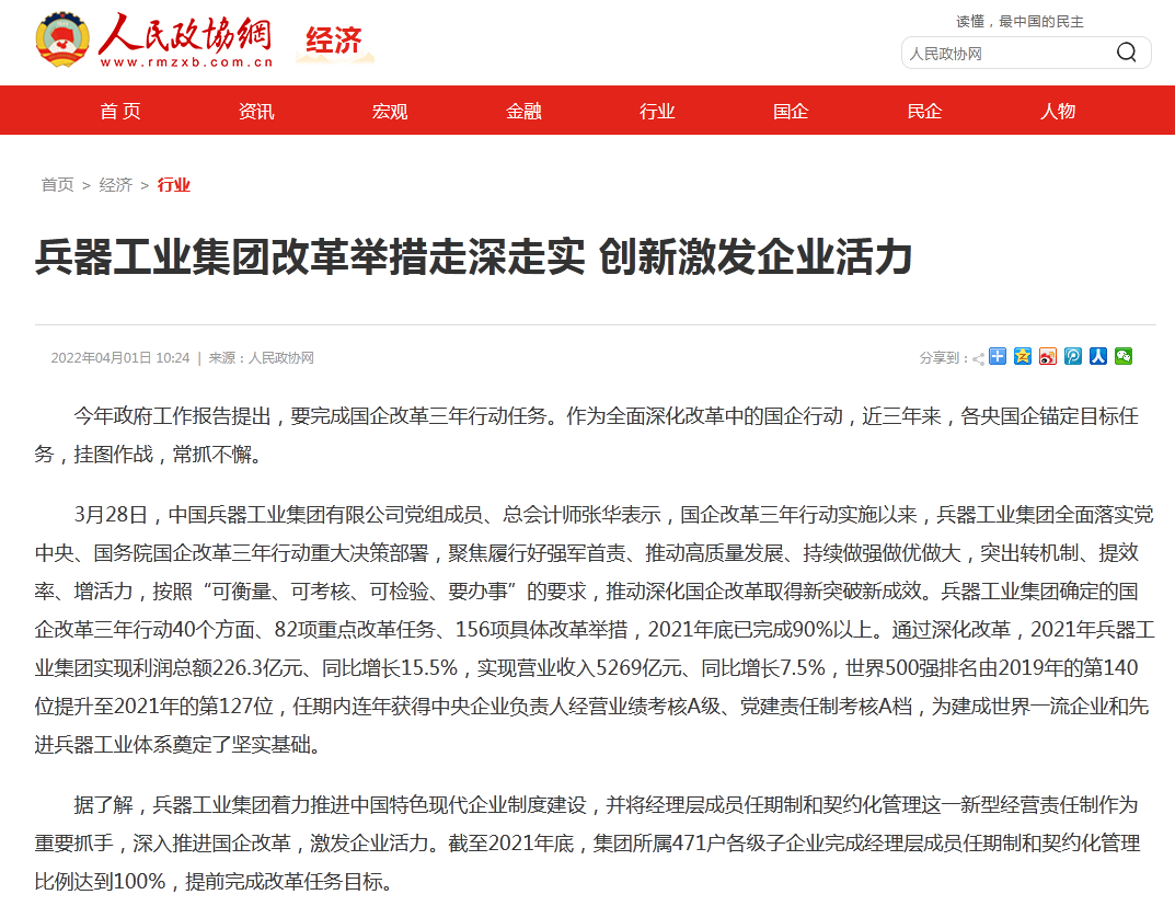 人民政協(xié)網(wǎng):兵器工業(yè)集團改革舉措走深走實 創(chuàng)新激發(fā)企業(yè)活力
