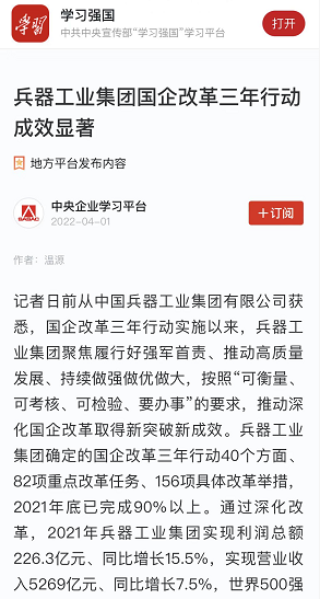 學習強國平臺:兵器工業(yè)集團國企改革三年行動成效顯著