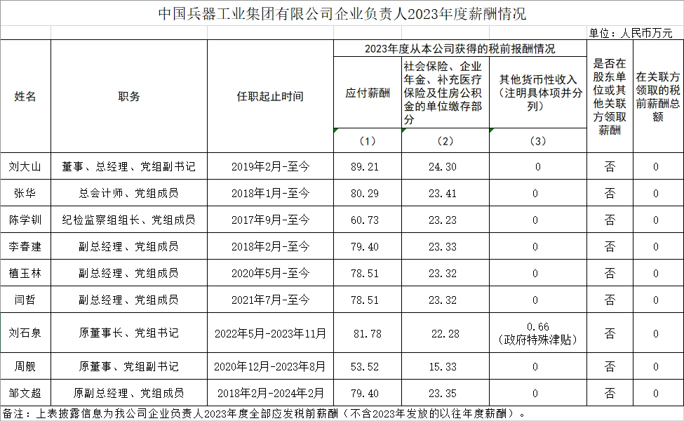 中國兵器工業(yè)集團有限公司企業(yè)負(fù)責(zé)人2023年度薪酬情況