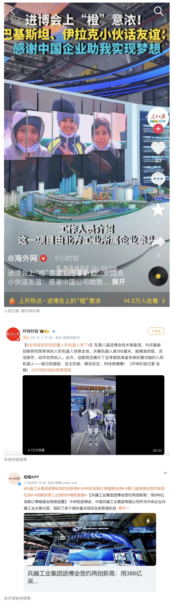 11月5日至10日,中國兵器工業(yè)集團(tuán)有限公司組團(tuán)參加第八屆中國國際進(jìn)口博覽會。集團(tuán)公司以“堅(jiān)持合作共贏,推進(jìn)高水平對外開放,助力構(gòu)建新發(fā)展格局”為目標(biāo),圍繞“新征程,共創(chuàng)未來”主題組團(tuán)參展,集中展示了一系列新技術(shù)、新理念、新成果,取得豐碩成果,受到廣泛關(guān)注。 嘉賓云集 本屆進(jìn)博會上,蒙古國駐華大使、贊比亞礦業(yè)和礦產(chǎn)開發(fā)部常任秘書、津巴布韋首席司長等多國政要蒞臨集團(tuán)公司組展展區(qū),了解有關(guān)項(xiàng)目情況。 國家能源集團(tuán)、東風(fēng)汽車、哈電集團(tuán)、鞍鋼集團(tuán)、中鋁集團(tuán)、通用技術(shù)集團(tuán)、中國中車、中國長安汽車、中國電建等央企領(lǐng)導(dǎo),工信部、國務(wù)院國資委、中國貿(mào)促會、陜西省、上海市、浙江省等國內(nèi)政府部門領(lǐng)導(dǎo)以及國內(nèi)外合作伙伴蒞臨集團(tuán)公司組展展區(qū)參觀指導(dǎo)。對集團(tuán)公司高質(zhì)量共建“一帶一路”,與各國合作伙伴共享發(fā)展機(jī)遇、實(shí)現(xiàn)互利共贏給予高度評價(jià)。 媒體關(guān)注 集團(tuán)公司集中簽約亮相央視綜合頻道《新聞聯(lián)播》、央視新聞?lì)l道《朝聞天下》《新聞30分》《共同關(guān)注》、央視財(cái)經(jīng)頻道《正點(diǎn)財(cái)經(jīng)》《經(jīng)濟(jì)信息聯(lián)播》。 《環(huán)球時(shí)報(bào)》、環(huán)球網(wǎng)、《新京報(bào)》、《中國旅游報(bào)》等對集團(tuán)公司人形機(jī)器人、四足機(jī)器人、涵道穿戴式載人飛行器、外骨骼等多型新域新質(zhì)產(chǎn)品,集中亮相進(jìn)行報(bào)道。新華社、央廣中國之聲、新京報(bào)(貝殼財(cái)經(jīng))、上海廣播電視臺等媒體直播探館,打卡兵器“硬核科技”。 人民日報(bào)客戶端、新華社客戶端、人民網(wǎng)、中國網(wǎng)、中國日報(bào)網(wǎng)、國務(wù)院國資委網(wǎng)站、國資小新微信公眾號、國資小新Facebook、學(xué)習(xí)強(qiáng)國中央企業(yè)學(xué)習(xí)平臺、經(jīng)濟(jì)觀察網(wǎng)、新京報(bào)客戶端等第一時(shí)間刊發(fā)集團(tuán)公司組展簽約、ESG建設(shè)等情況。新浪財(cái)經(jīng)、界面新聞等商業(yè)平臺閱讀量累計(jì)超500萬次。 在微博、抖音等新媒體平臺上,集團(tuán)公司高科技產(chǎn)品演示、5D穹幕電影體驗(yàn)等短視頻持續(xù)引爆流量,累計(jì)播放量超800萬次,點(diǎn)贊量破50萬。“兵器工業(yè)集團(tuán)進(jìn)博會簽約386億”相關(guān)話題登上微博熱搜榜,閱讀量破5000萬次。 文字丨劉暢 |