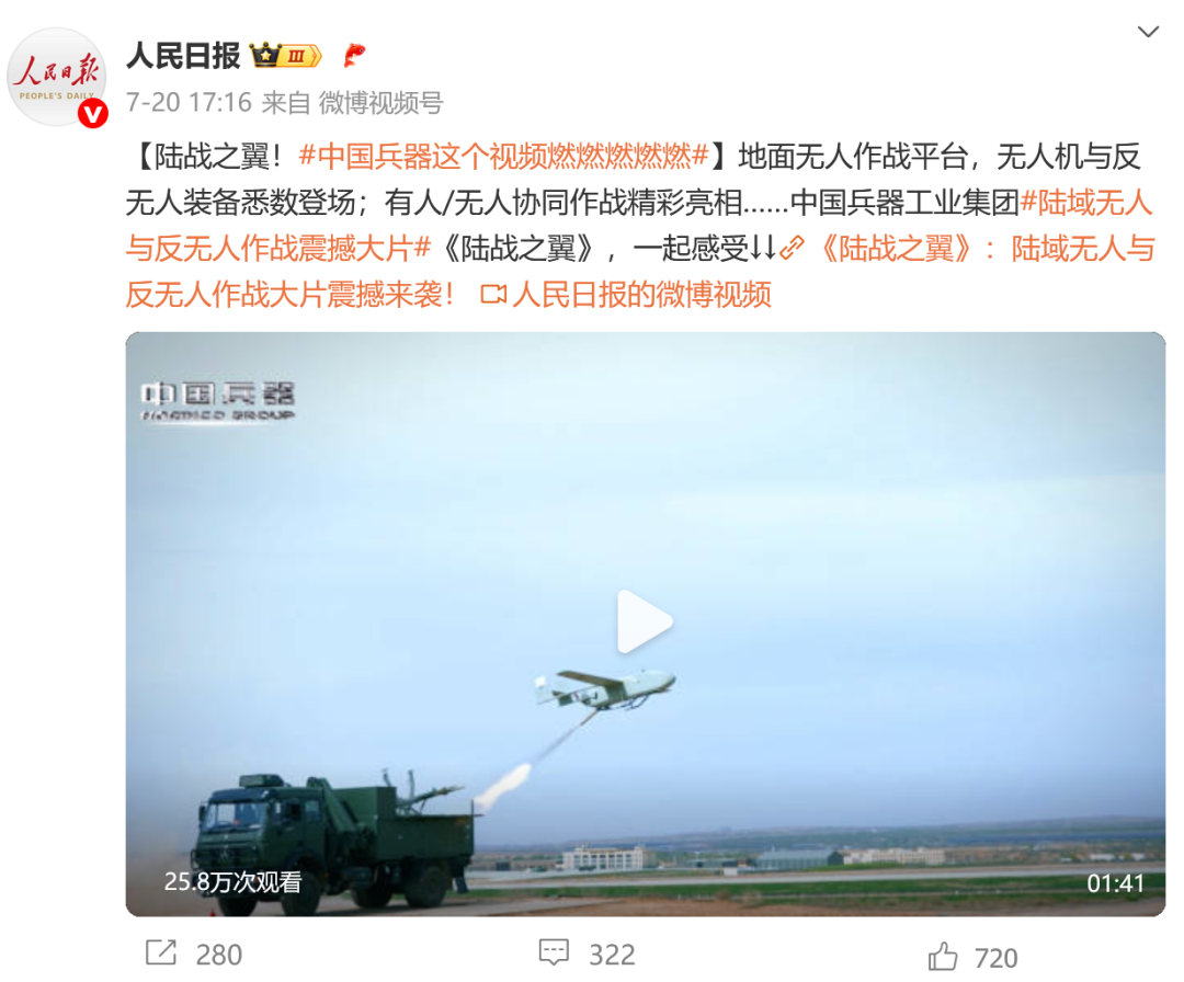 7月21日,中國兵器工業(yè)集團有限公司在位于內(nèi)蒙古的某試驗場舉辦軍貿(mào)陸域無人與反無人作戰(zhàn)體系主題日活動,攜無人機、巡飛彈、反無人機等最新武器裝備登場亮相,展現(xiàn)了一場無人與反無人領(lǐng)域激烈對抗的實戰(zhàn)場景。中央主流媒體、地方媒體、知名網(wǎng)絡(luò)媒體,以及集團公司各宣傳平臺紛紛進行報道,多次登上熱搜,引發(fā)廣泛關(guān)注。