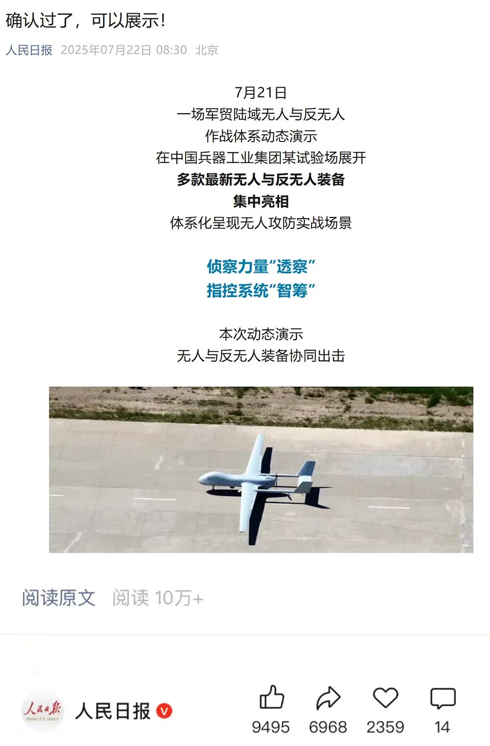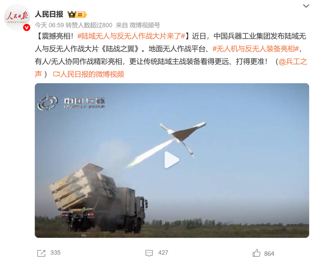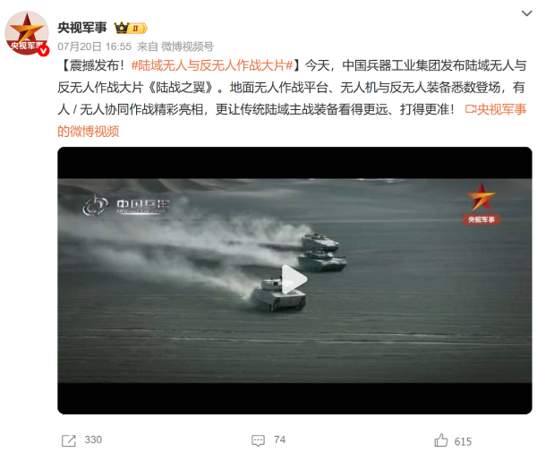 人民日報微博、央視軍事微博、央視新聞客戶端、中國新聞網(wǎng)、中新社國是直通車抖音、環(huán)球網(wǎng)微博、環(huán)球時報(X平臺、英文版客戶端)、中國日報網(wǎng)、央視軍事報道微博、中國軍號微博、中央廣播電視總臺“空天逐夢”微信視頻號、共青團中央B站、國資小新微博等中央主流媒體、國家部委的新媒體播發(fā)集團公司陸域無人與反無人作戰(zhàn)大片等視頻作品。
