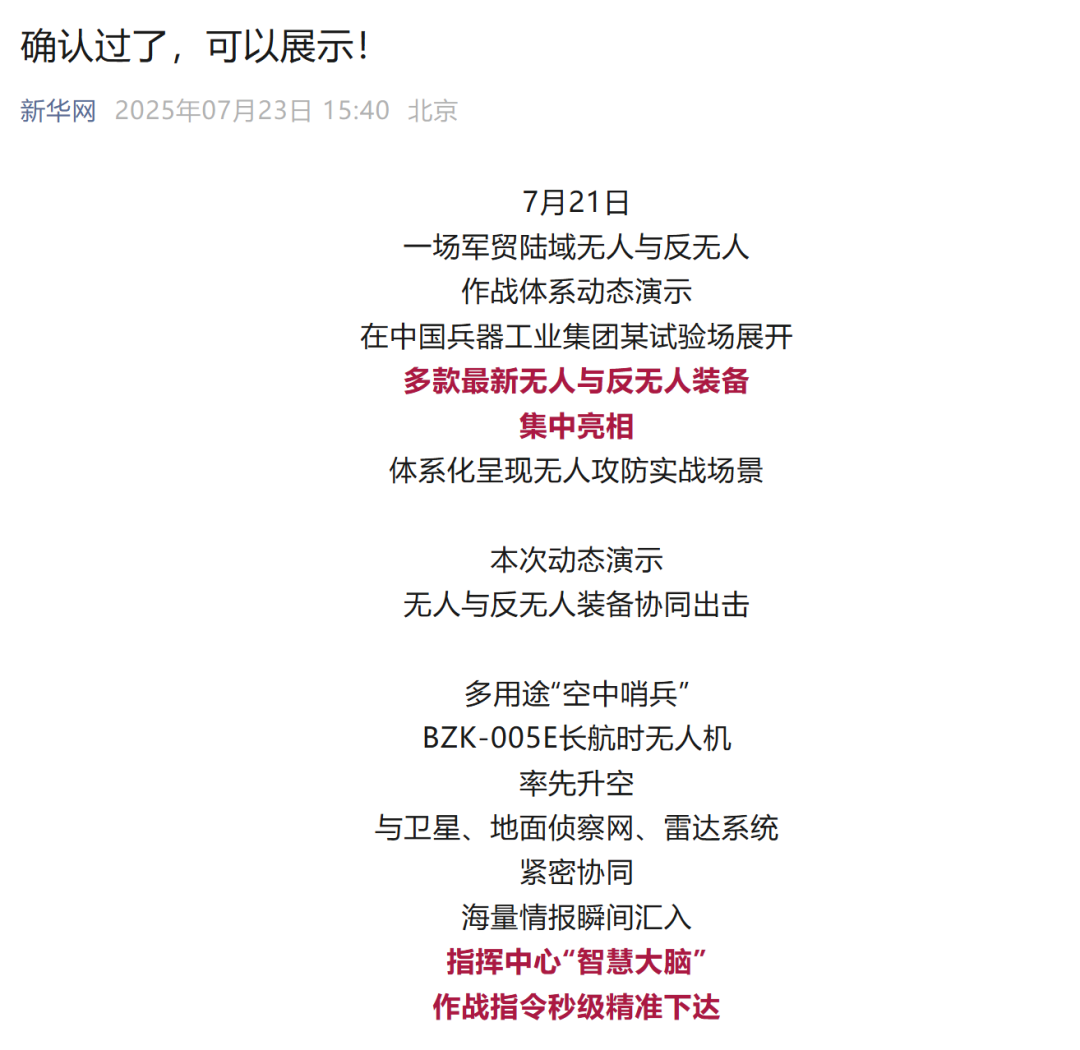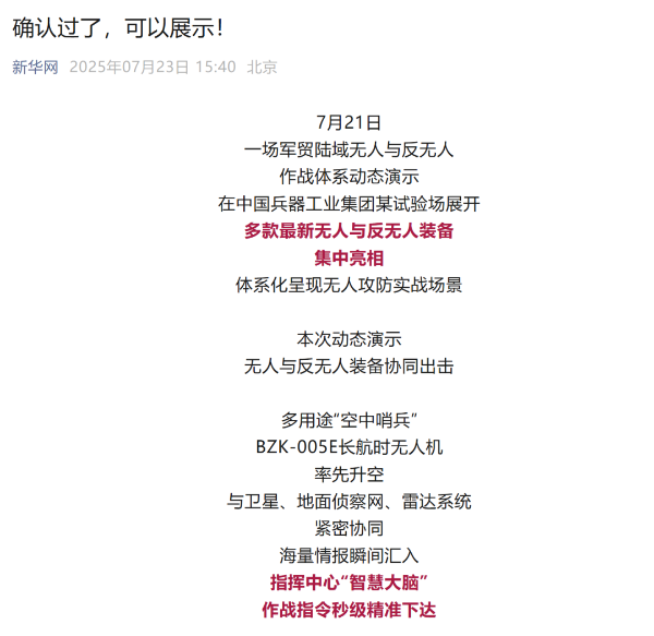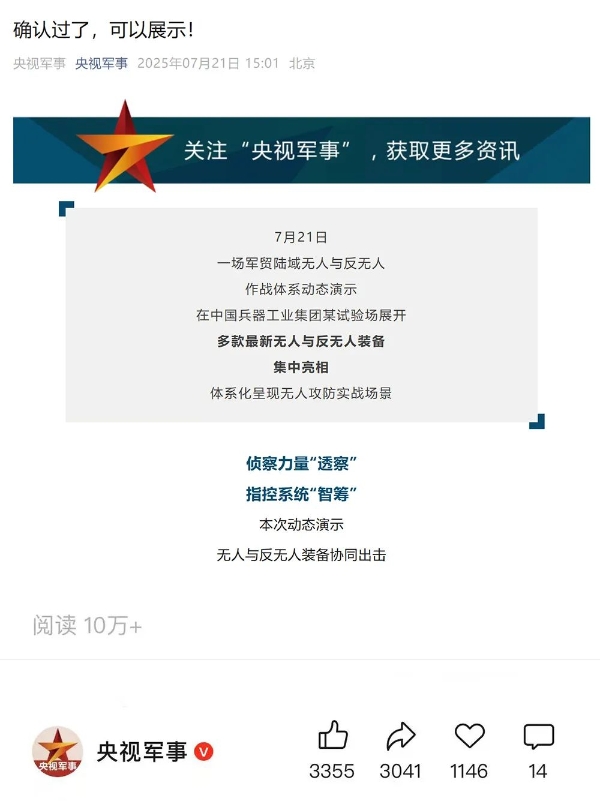 央視新聞客戶端:兵器工業(yè)集團陸域無人與反無人作戰(zhàn)體系震撼來襲!搶先看!2025-07-24