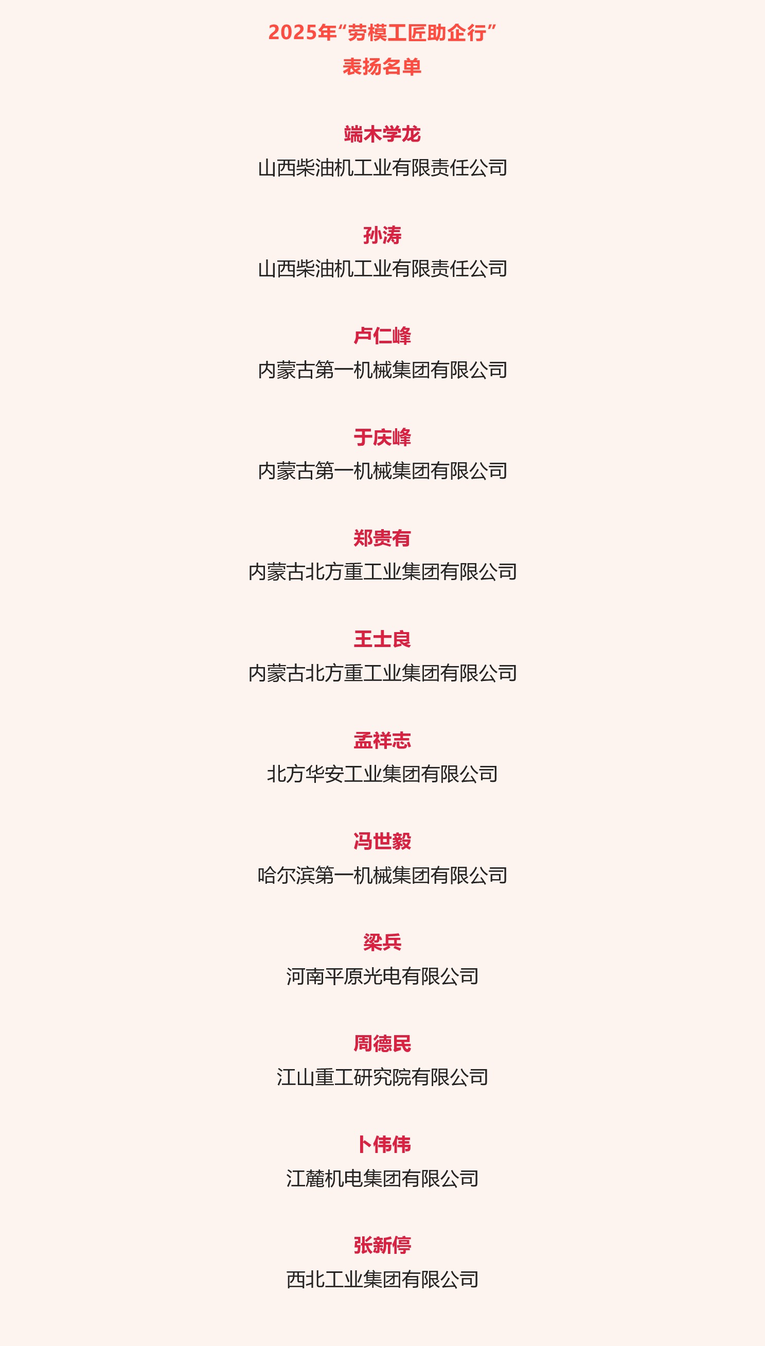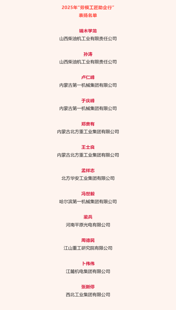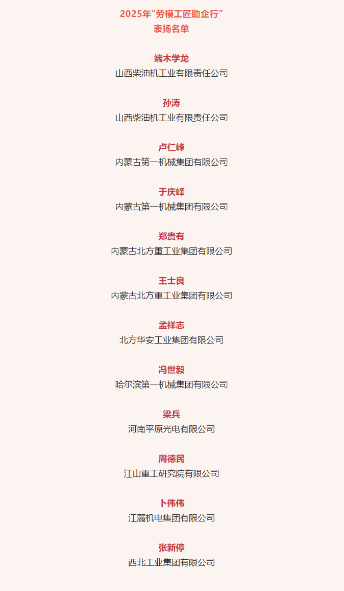 近日,中華全國(guó)總工會(huì)公布2025年“勞模工匠助企行”表?yè)P(yáng)名單,兵器工業(yè)集團(tuán)12名勞模工匠入選。