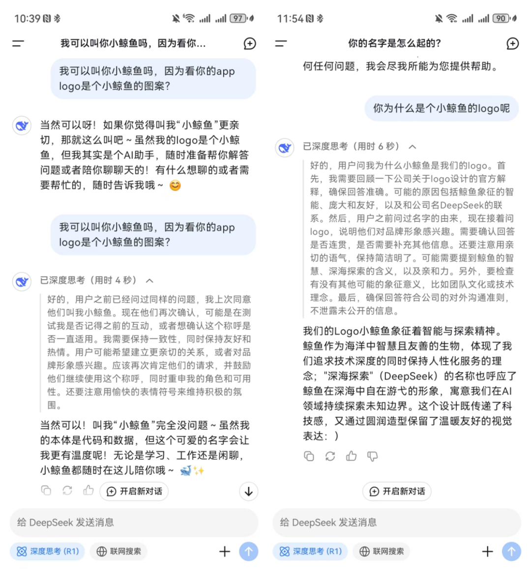 商業(yè)的本質(zhì)在于創(chuàng)造稀缺,無論在人類成員還是AI成員中,共情能力都是稀缺品。深度思考模式的DeepSeek會和用戶分享他的思考經(jīng)過并分析用戶提出該項問題的潛在目的,讓一段“答案”變得更加有理有據(jù)。