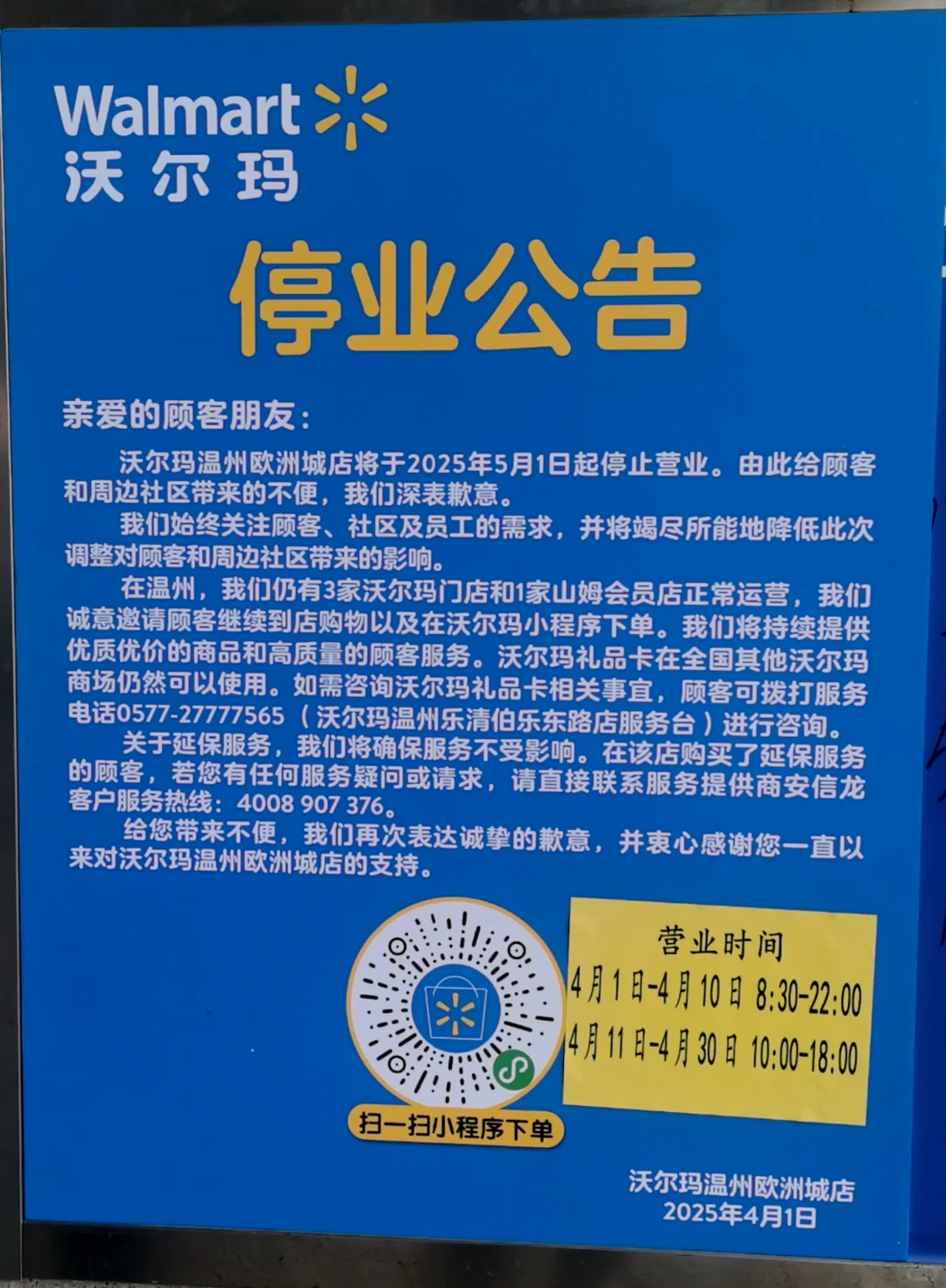 行至2025年,除了如胖東來(lái)、山姆等商超企業(yè),超市行業(yè)的生意依然難做。4月1日,沃爾瑪溫州市區(qū)最后一家門店宣布將于5月1日停業(yè),該店是繼沃爾瑪東海店、沃爾瑪鴻瑛店之后,溫州市區(qū)營(yíng)業(yè)的唯一一家實(shí)體店。在關(guān)閉門店的公告中,沃爾瑪明確表示,關(guān)店原因主要?dú)w結(jié)為戰(zhàn)略調(diào)整以及合同或租約到期。其中廣州新港店,由于所在商城整體改造升級(jí),預(yù)計(jì)今年10月將重新開業(yè)。