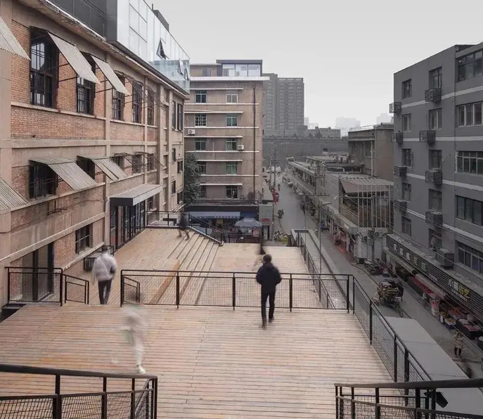 作為發(fā)起點,現(xiàn)有菜場部分被完全保留。項目最核心的“修補”有三處:連接市場入口與1、2號樓的臺階廣場,連接地面層與2號樓屋頂?shù)慕煌ㄍ玻约斑B接2號樓屋頂和3號樓的連橋。開敞的臺階廣場層層上行,不僅引導(dǎo)人流進入上層空間,還成為了菜場公共生活的舞臺。同時,廢舊廠房改造成了如今免費開放的藝術(shù)展區(qū),這里不定期會舉辦各式不同主題的展覽活動,已經(jīng)成為新晉網(wǎng)紅打卡盛地。