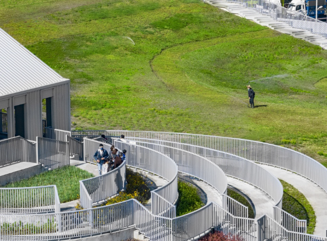 在建設(shè)空間設(shè)計上,項目將市場與公共綠地完美融合,摒棄了傳統(tǒng)菜市場簡單金屬棚的形式,屋頂打造為被草地和花田覆蓋的公園。建筑呈現(xiàn)為一個簡單的開放式結(jié)構(gòu),起伏的綠色屋頂猶如延綿的山丘,屋頂?shù)臇|側(cè)角落是一塊種植著繽紛植物和花卉的階梯狀區(qū)域,屋頂從該側(cè)向下延伸至地面,使游客可以輕松到達建筑頂端。在建筑的側(cè)面,一個簡單的四層結(jié)構(gòu)容納了市場的行政辦公室和展覽中心,后者可用于展示當?shù)氐霓r(nóng)業(yè)產(chǎn)品。