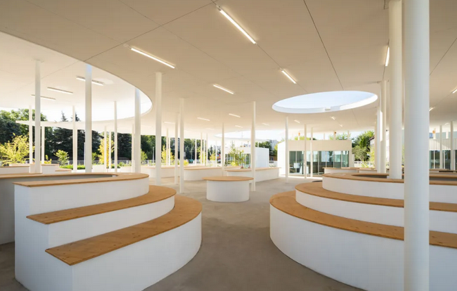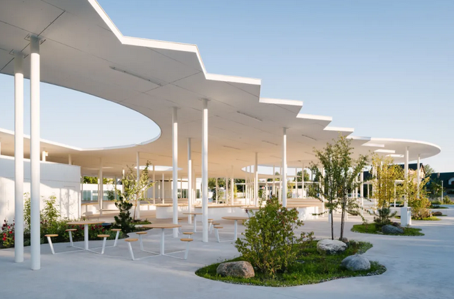 此外,廣場光滑的混凝土面層沒有路緣石,無論是步行、坐輪椅還是滑滑板都可以在市場上安全自由地移動,方便了不同人群的使用,體現(xiàn)了設(shè)計的人性化和包容性;各種街道固定裝置如白色的圓形信息板、自行車架、巨石、鳥類和昆蟲屋及社區(qū)共用桌椅等點綴其中。在極具特色的有機屋頂下,還設(shè)有帶木雕動物造型搖椅的游樂花園,為集市增添了藝術(shù)氛圍和趣味性。
